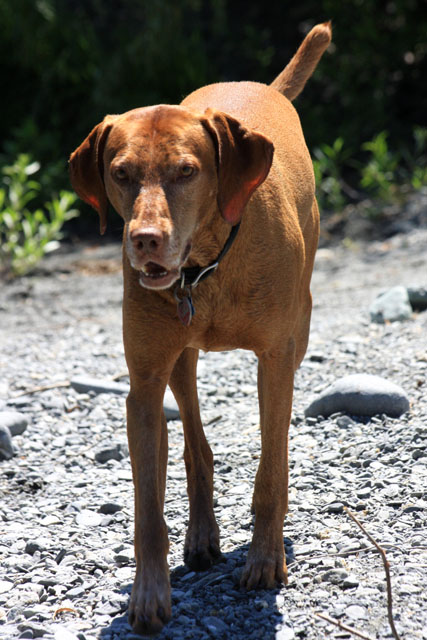 My friend Cory has a beautiful home in Hyampom, a tiny town about midway between Red Bluff and Willets, in Nor Cal. We mostly go up to have an All Girls' Horsey Vacation, but Buzz has come along a few times. Buzz has a buddy up there: Boo, Cory's female dog. Buzz met Boo when she was just a few weeks old (she was abandoned at three weeks!) and they've kept up their relationship. They play around the yard, but more significantly, Hyampom is where Buzz learned how fun water can be. He was driven into the water by the heat, but he quickly learned that most games that can be played on land can be played at sea.