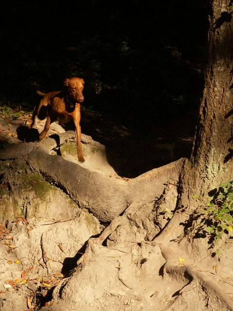 | When Buzz had been there a couple of years, though, Toby arrived on the scene. B and D weren't willing to walk out with us, but Toby was ready for anything. The adventure the pictures are documenting is a hike we took to see what damage the Martin Fire had done in upper Bonny Doon. It was awfully hot and the fire lanes that Cal Fire had made had been drenched - as to actually retard the fire, so both Buzz and Toby took full advantage of the opportunity. It took us weeks to get Buzz clean, even with his (heh heh) Buzz cut hair. |