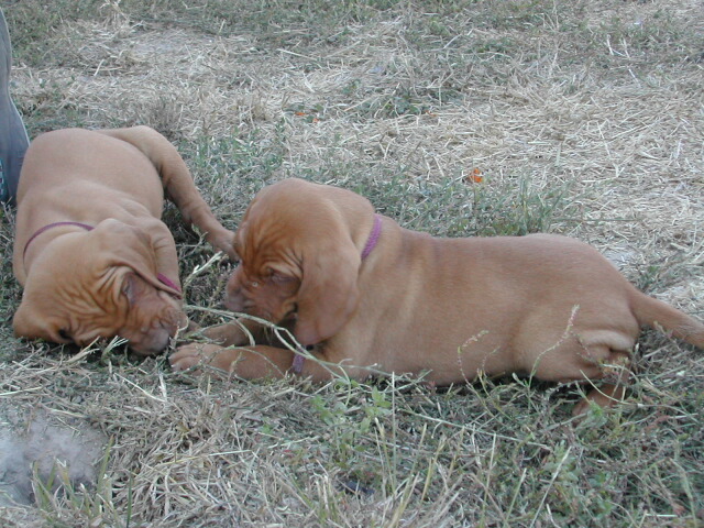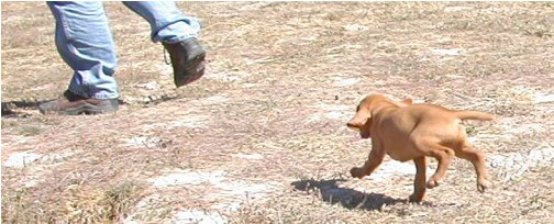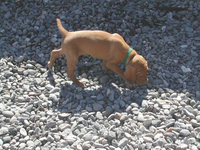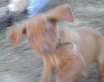 The rest of the pictures I kept in because . . . I couldn't throw them away? If we end up with one of the pups in these pictures, it will be excellent to have the photos. If not, well, someone will get these pups and they're awfully cute. Now that I think about it, there's a bunch of things to notice. I particularly like the two photo sequence where the three pups stumble over Jennifer's shoe before successfully organizing themselves to go Somewhere. I also like Mr. Maroon and his friend giving us a nice view, first fore and then aft. And it looks like Miss Berry has an early start on a point. And those might be ankle-breaker holes to you but they're The Great Gopher Canyons to these guys.
