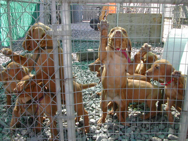 When all of us were assembled, we moved out to the kennel (aka Stalag 17). The pups were ready to bust out, with or without Marian's help; when she opened the door, the wave was released. They all bolted around the corner and then skidded to a stop to check out the new objects in their environment.