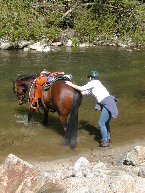We did make it to the river without any surprizes on UCONN or Pogonip, which was actually the part I, at least, was most concerned about. It was a beautiful and warm day, so the horses were really willing to drink and hang out. I think Shawn was trying to push Elias into river, but I'm not sure why. |