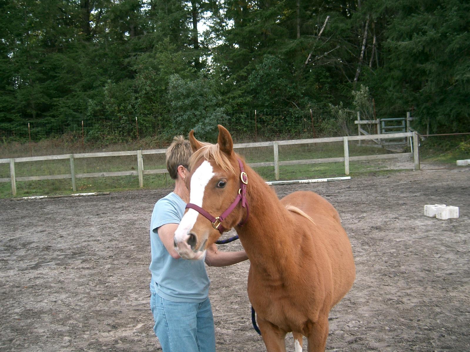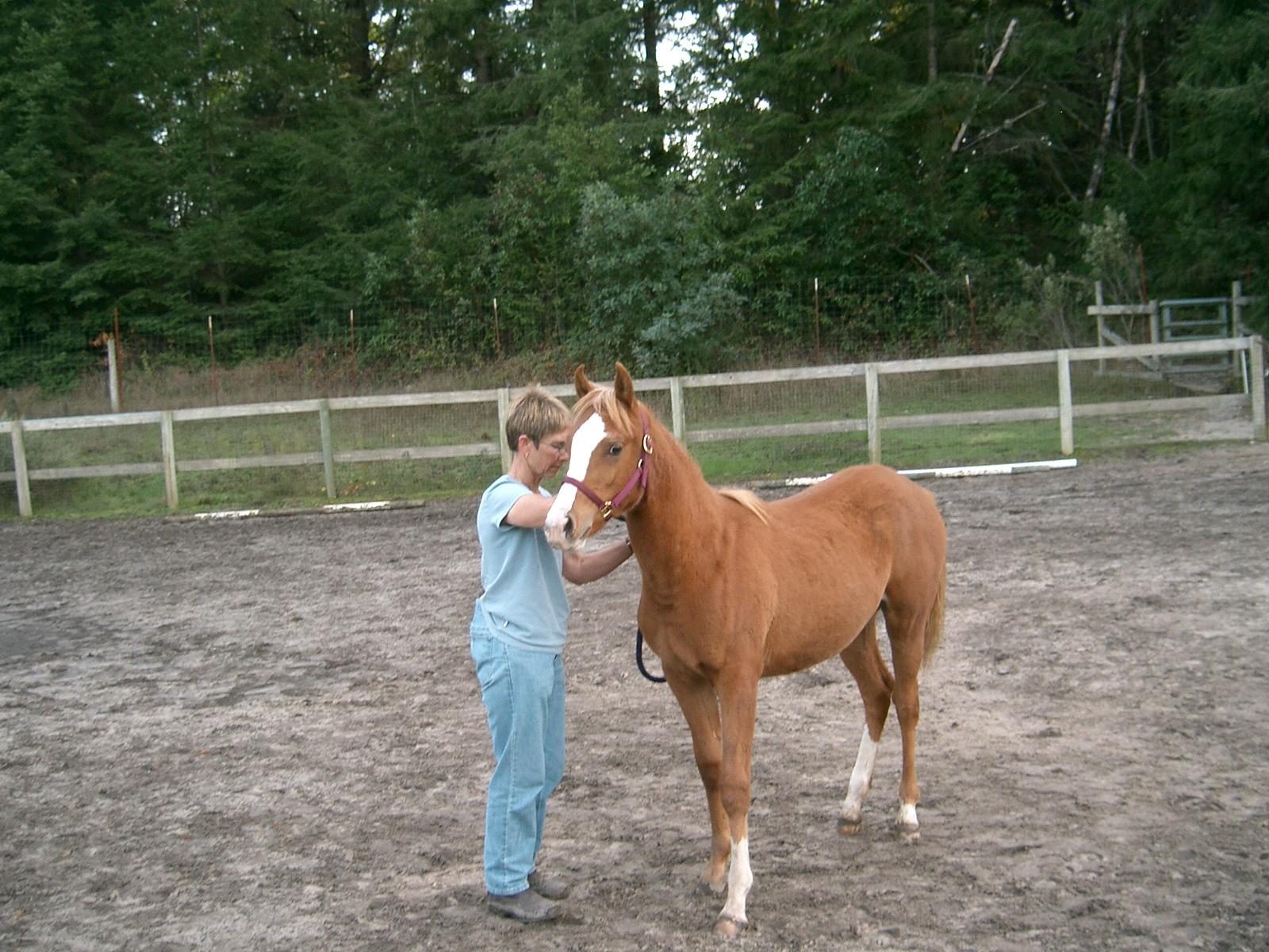 The big event in her second week was the trip down to the arena. Shannon's assignment for us is leading, catching and lifting feet. She's doing pretty well on the leading. She's been frightened there a couple of times, and she is really anxious. I can always catch her by going to the gate, but so far she hasn't actively come to me. We made progress on the foot lifting. We were okay in front, but the back is a bigger problem.