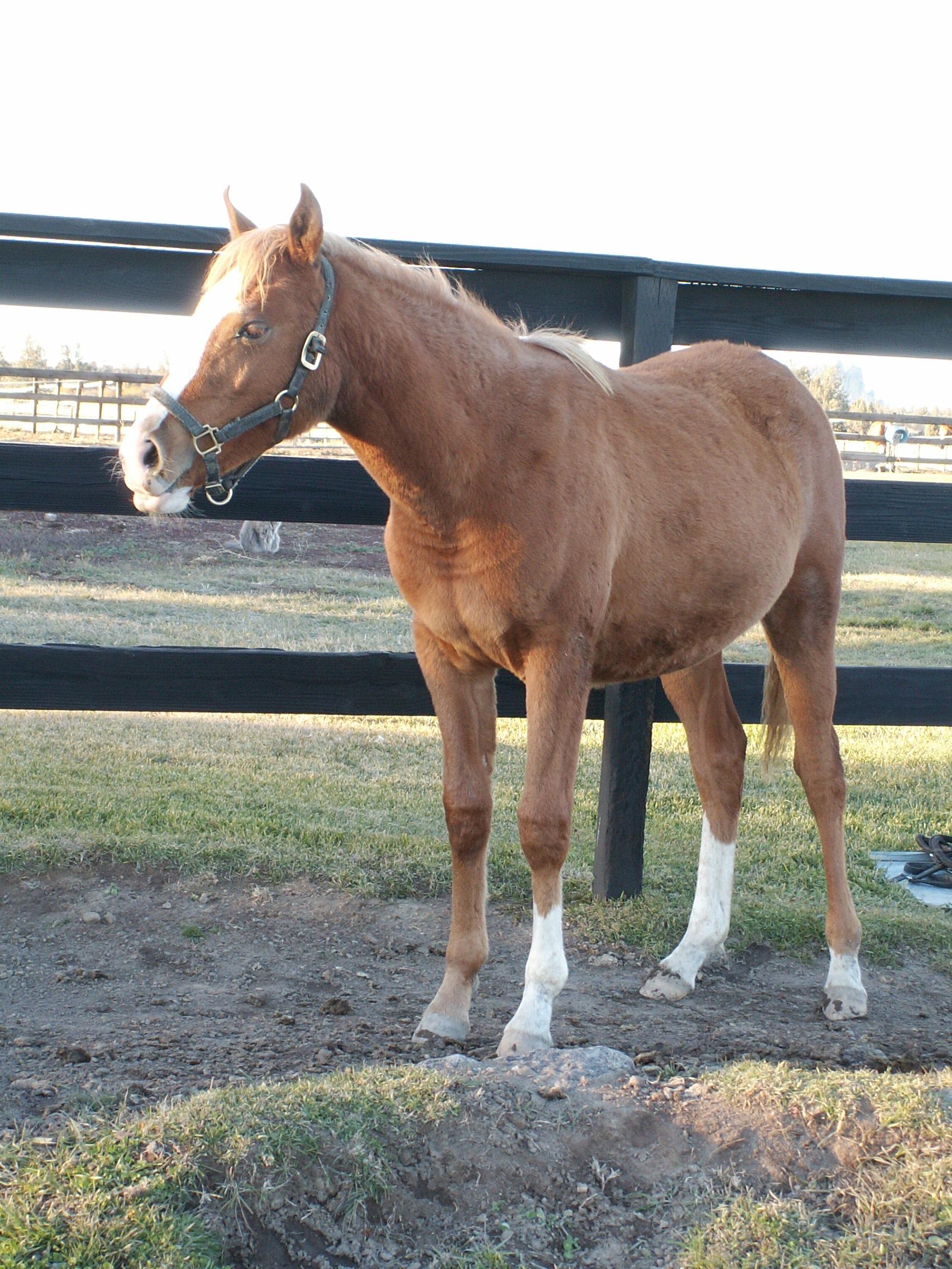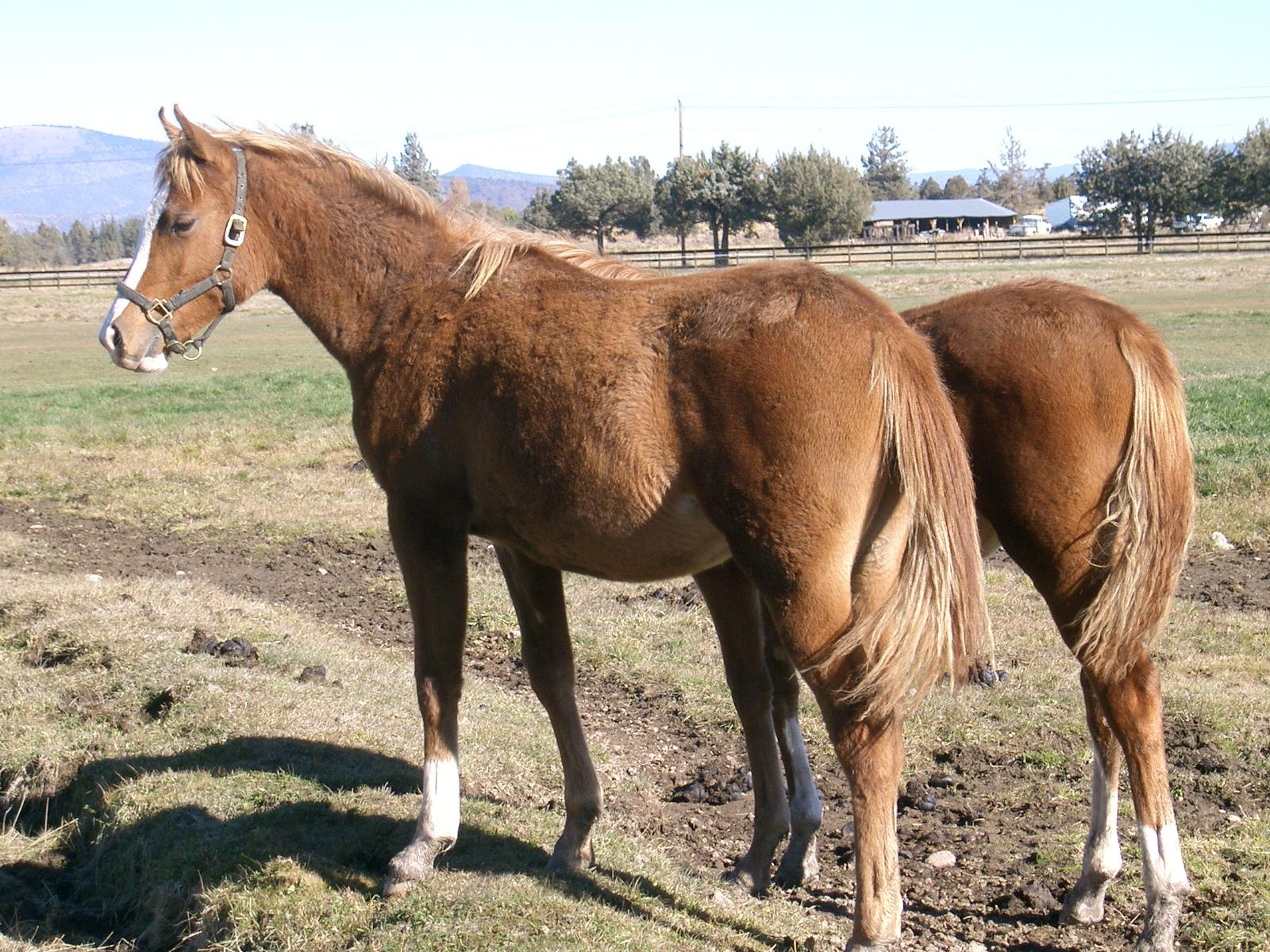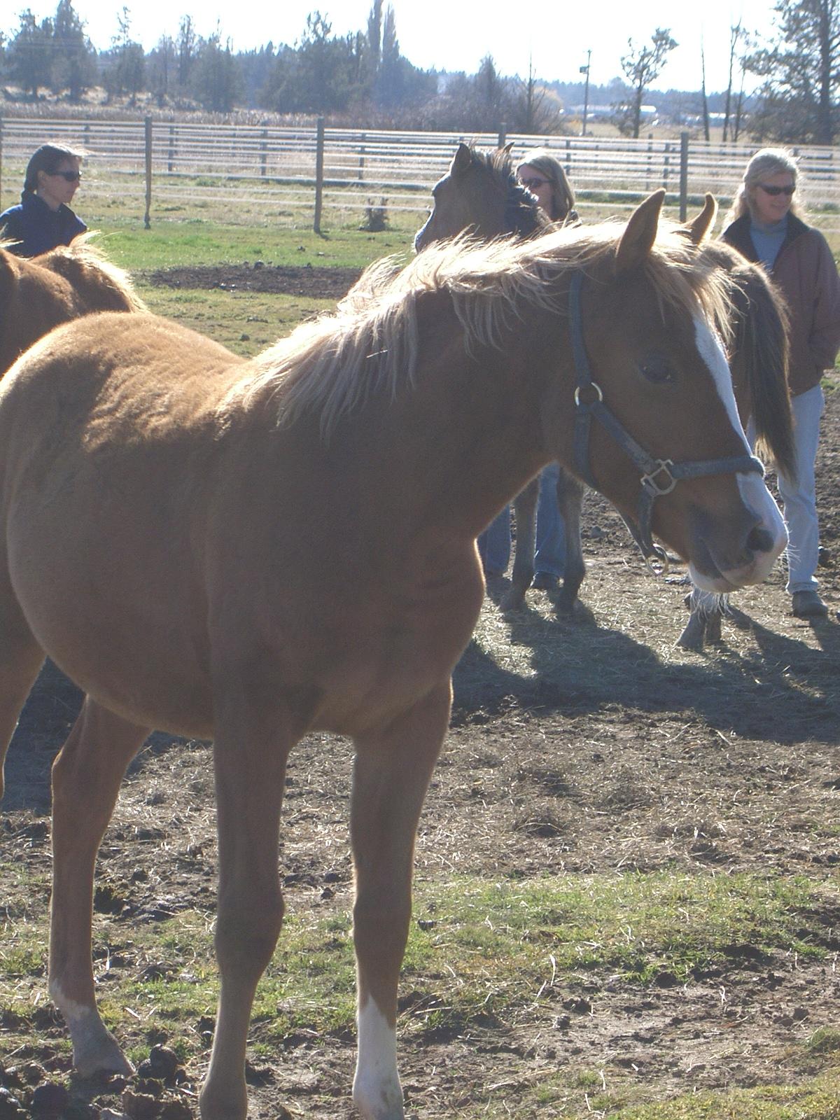 I had talked to Ray Berta about how to approach the first day with my new baby. He said I should spend as much time with her as possible and "make her want to be with me." I think he didn't have in mind that she and I would be in a 10 acre pasture with 5 other 8 month old horses. (Oh yeah, Jien was born on 20 Feb, 2004, so she was about 8 months old when we picked her up.)