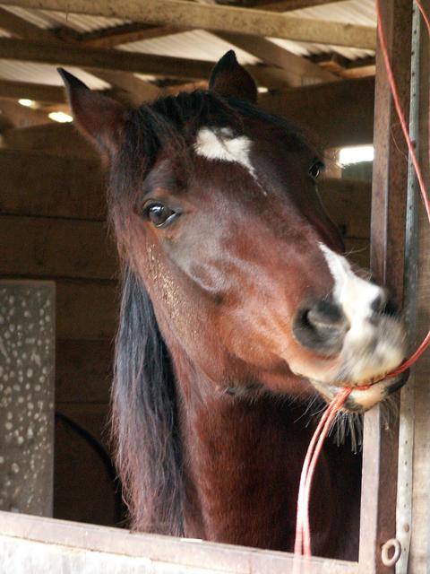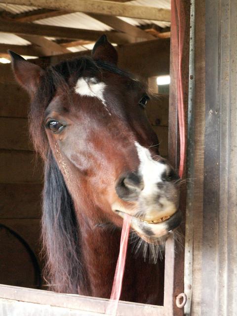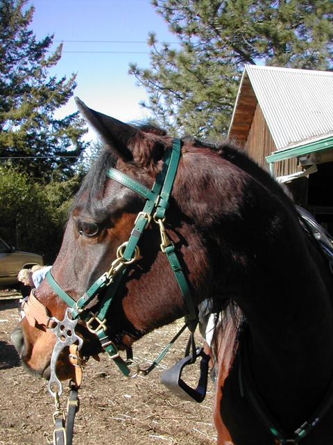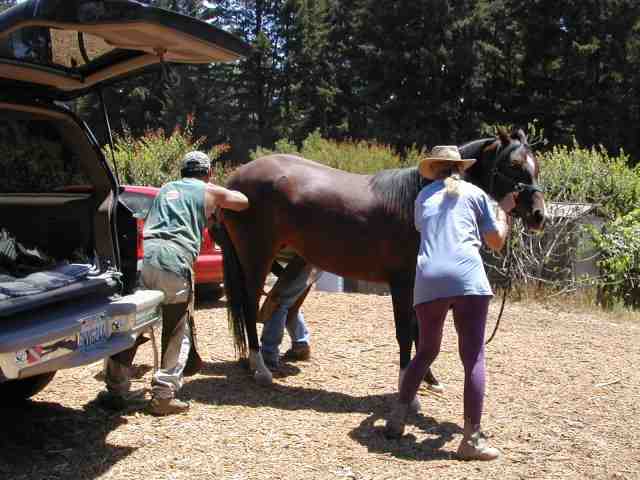 Kharin got shoed today - if there was any doubt about her white feet, it should be resolved now. Those feet are WHITE!! She also demonstrated another hint of a devoloping personality; note that at one point it was taking three people to keep her from climbing into Suzanne's Explorer and going home with Louie. Finally, earlier I caught this "smoking gun" photo of Kharin checking for carrots.