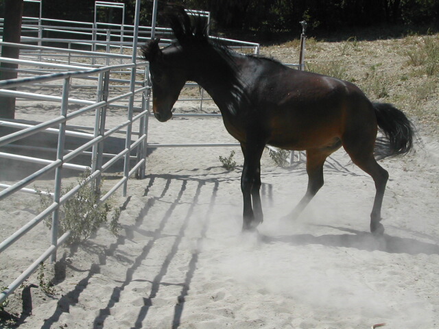 As soon as she got put in her paddock, the Kids had to introduce themselves. First came Nadia, in a cloud of dust. Then came Kharina's prolonged first exposure to Zeph: First he approached and she didn't look at him. Then she looked. Then she allowed him to get close. Then Zeph couldn't stand it anymore and essploded. His Mother *did* teach him manners, he just ignored her like he does everybody else.