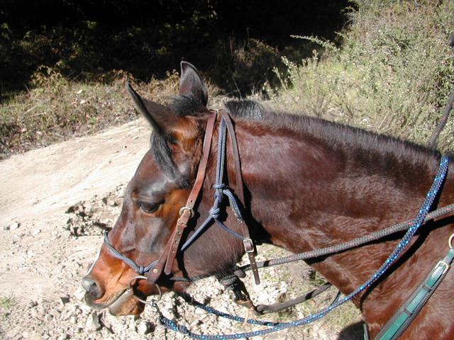 Kharina went out with Tuffy, Ms L, and Al today (22 June). Before we left, Kharina had to do some arena work to put her in the right frame of mind. The first picture is purely for archival purposes: if we ever need to know exactly how big Judy and Kharina's rear ends were on 22 June 2002, we know where to look. The second picture is of Kharina walking between the lines; contrary to the way the picture looks, she is NOT walking on top of the pipe. Finally, an over-the-shoulder shot of Judy and Kharina on the trail. I kept it in because Wayne said it was a good picture because of the color and you can see Judy's face - and Judy believes everything Wayne says, so . . .