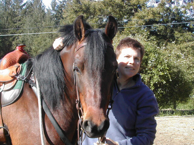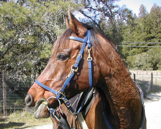 After we crossed Empire Grade, the plan was to take the UC fire roads to Pogonip and UCONN, cross Highway 9 and follow the trail to the San Lorenzo river. As you can see, we made it, but it was not without adventure. First, Debbie decided that Alex was going to learn to love cyclists, so every time she saw one (and she saw lots of them), she gave them a horse treat to give to Alex. It didn't take long for Alex to stop and mug every cyclist he saw. At least one nice young guy stopped to count his fingers after he'd done his part to train Alex. Second, another of those things that Alex took a conservative equine approach to was utility service access points - the concrete panels set in the road, with metal plates that lift off for maintenance. There are probably ten of those set in Chinquapen and Alex hopped at every one he noticed.