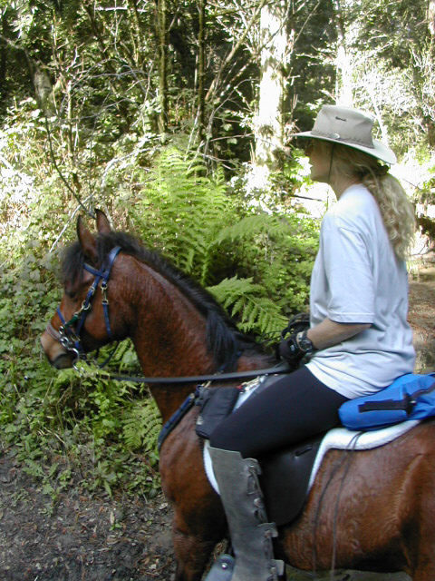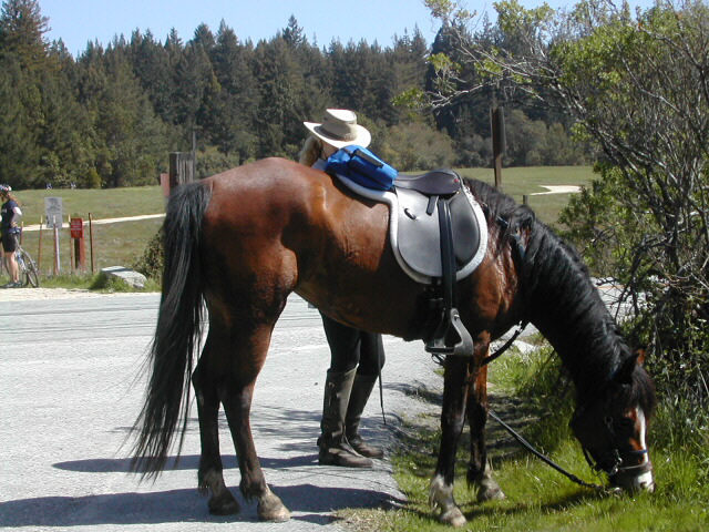 Shawn, Judy and I rode from the barn and met Julie and Debbie at Smith Grade, where we joined together and headed for Woodcutter's. We were doing well, with Judy and Nadia leading until we crossed the first of many little rivulets across the road. As it turns out, Alex is a pretty conservative guy and water crossings hadn't come up much in his life to date. As a result, he took fast and agressive evasive action to avoid crossing this one. Debbie stayed aboard, but only just barely, so we developed a "stop and walk" policy for crossing running water. Unfortunately, there's so much water on Woodcutter's that the longest we could walk uninterrupted was about 100 yards. It took awhile, but we made it to the intersection with Chinquapin. We all took a break there before crossing at Twin Gates, and Nadia took advantage of the opportunity to get a little roughage. |