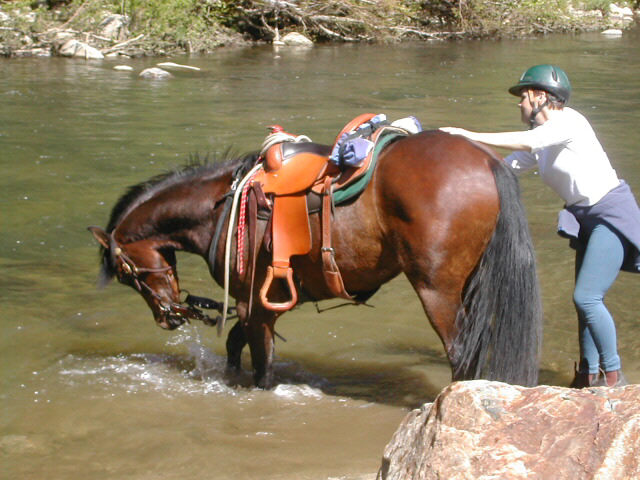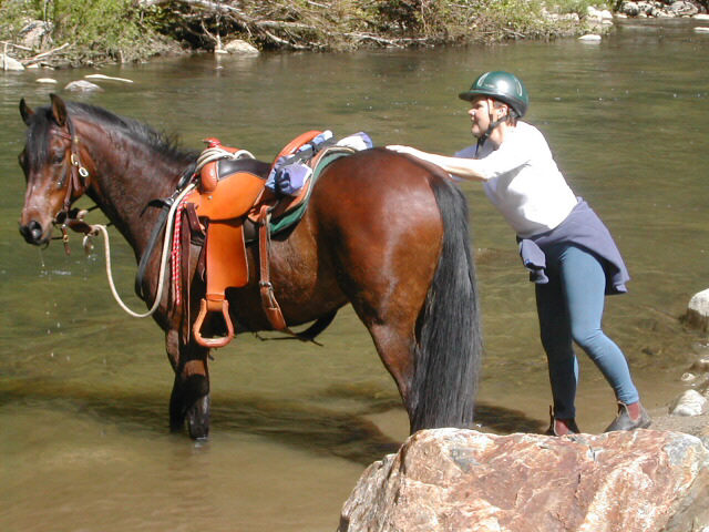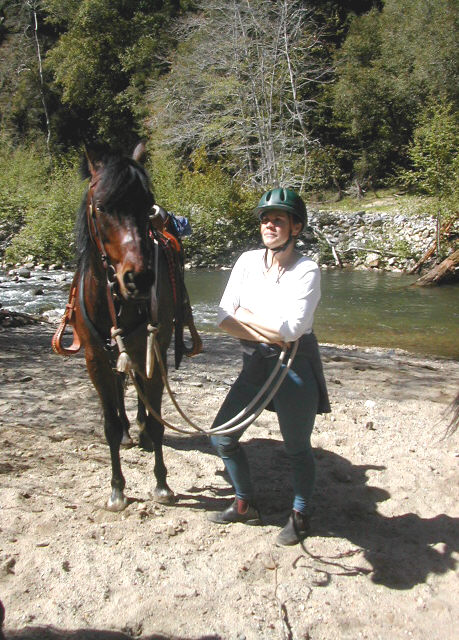 We did make it to the river without any surprizes on UCONN or Pogonip, which was actually the part I, at least, was most concerned about. It was a beautiful and warm day, so the horses were really willing to drink and hang out. I think Shawn was trying to push Elias into river, but I'm not sure why. |