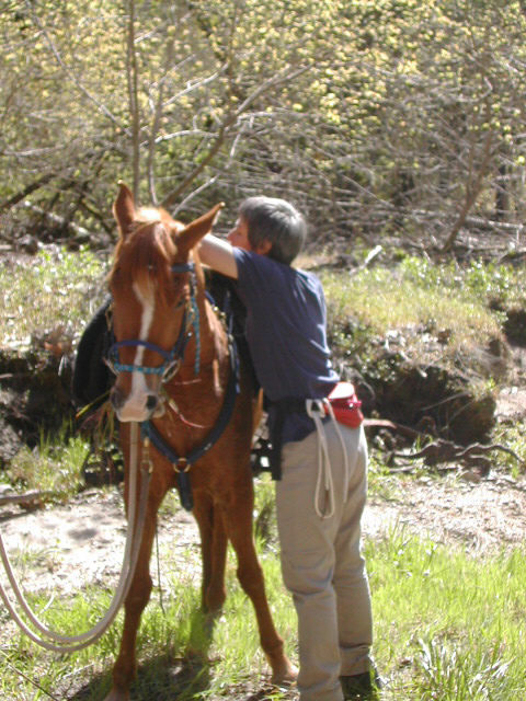 We hustled back up from the river, stopping a couple of times to graze the horses. And, yes, Ali did eat grass. She's a changed mare since she got her bit. The only mishap was that Debbie forgot Alex's hopping protocol at the utility ports and got dumped pretty near the top of UC. We dusted her off, threw her back on Alex and took off again. We stopped at Twin Gates to compose ourselves. |